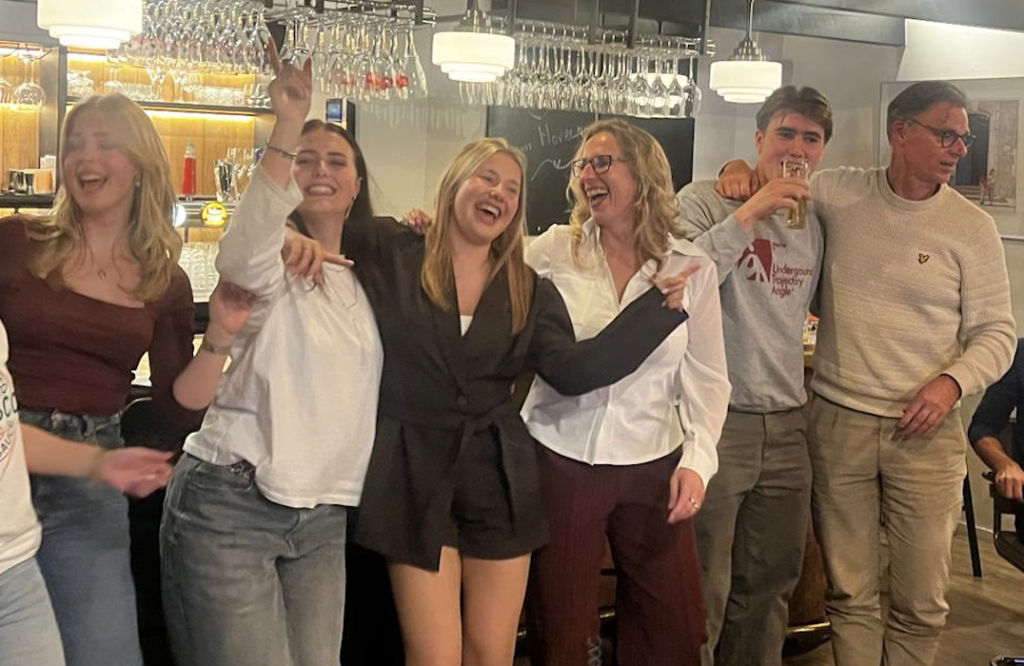 Het was een vrolijke boel in het clubhuis. Woensdagavond nam Famke tijdens een gezellige avond afscheid. Met twee populaire jaren in de bediening had ze wel een feestje verdiend. Er kwamen heel wat mensen op af. Na cava en lekkere hapjes was het tijd voor een hilarische pubquiz. Ongeveer alle geformeerde groepjes wonnen een prijs, om de stemming erin te houden. Op de foto zie je de uitgelaten wereldreiziger (ze vertrekt voor vier maanden naar Azië) naast haar moeder en vrienden.